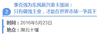 2016年5月23日,李克强总理到湖北十堰考察东风商用车重卡新工厂,在装配生产线旁应邀为新型重卡加油。总理说,“这不仅是为东风加油,也是为中国制造加油!”随后他登上一辆重型卡车并强调,东风发展要力戒“大而全”。只有做强主业、做优品质,才能在世界市场一争高下。
