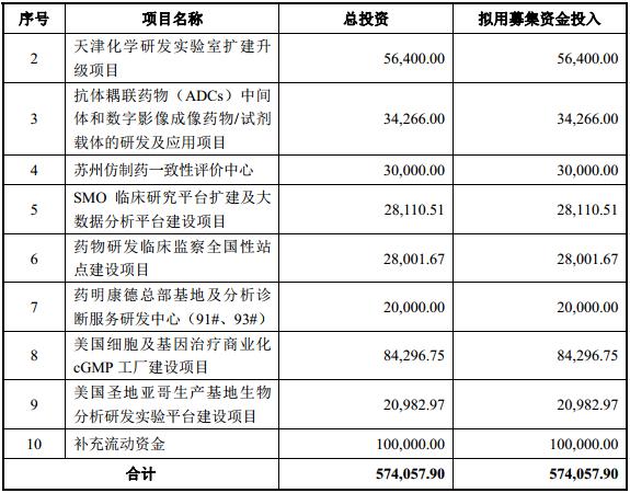 此次药明康德发行股份募集的资金在扣除发行费用后也将主要用于公司关于研发平台和中心的9大项目建设以及补充流动资金,总共计划投入约57.41亿元。值得注意的是,这与此前传言将募资200亿元有较大出入。