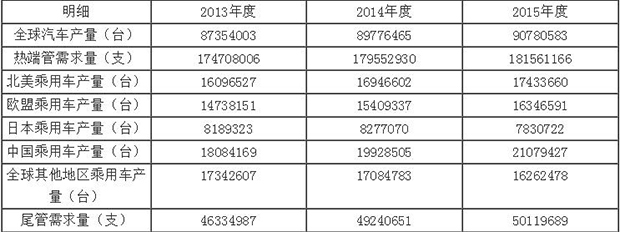 尾管系装饰管件,安装尾管的主要是乘用车,每台整车安装数量在 1 至 4 个不等。随着人们对汽车外观的要求越来越高,尾管已逐渐成为整车制造商的标准配置,乘用车的尾管装车率越来越高。乘用车尾管装车率跟整车品质、整车市场成熟度正相关,整车品质越高,乘用车装车率越高,整车市场越成熟,装车率越高。热端管系连接排气歧管和三元催化器的连接管件,依照排气系统的设计以及底盘悬挂的避让,每套汽车排气系统一般有 1-3 支热端管,平均为 2 支。根据全球汽车、乘用车产量情况测算了 2013 至 2015 年尾管、热端管市场需求量,具体情况如下表: