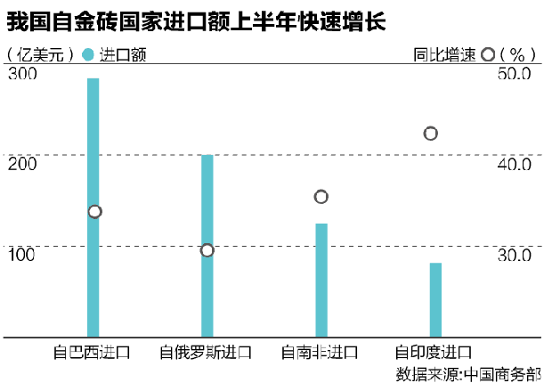2017年上半年,我国自金砖国家进口快速增长,金额超过701.6亿美元,增速达33.6%,高于同期外贸进口增速14.7个百分点,占我国外贸进出口总额的8.1%。其中中国自巴西进口金额289.3亿美元,同比增长33.5%;自俄罗斯进口金额203.4亿美元,同比增长29.4%;自印度进口金额82.3亿美元,同比增长42.5%;自南非进口金额126.6亿美元,同比增长35.4%。