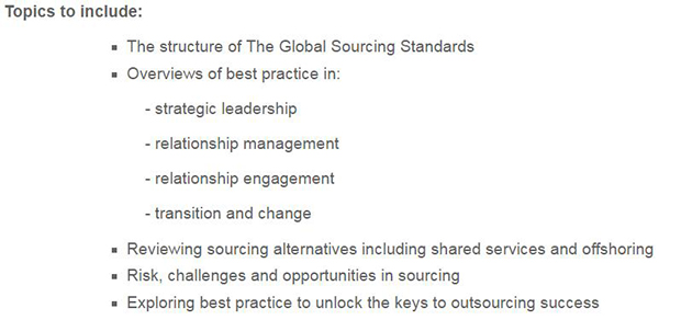 本次活动主旨介绍通过最佳全球采购标准,检验外包时间关键性原则,以及一个被行业参与者定期审查的工作框架。