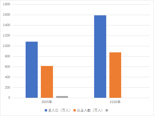 目前,成都已正成为海内外服务外包产业的资源汇聚地,成为众多跨国公司和国内知名企业实施战略布局的重要城市之一。从成都市发展服务外包产业前后的经济数据来看,成都市生产总值由2005年的2371亿元增长到2016年的12170.2亿元,翻了几番;三类产业结构由2005年的7.7:42.5:49.8调整到2016年3.9:43.0:53.1,第三产业比重明显提高,而且成都市服务贸易也得到快速发展,2016年服务贸易进出口额超过120亿美元,而2005年四川全省服务贸易进出口总额只有7.7亿美元。另外,成都市的从业人口规模也有明显提升,2016年总从业人员达到876.7万人,比2005年增加两百多万人。