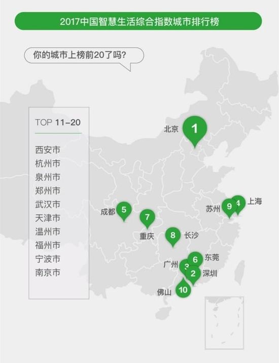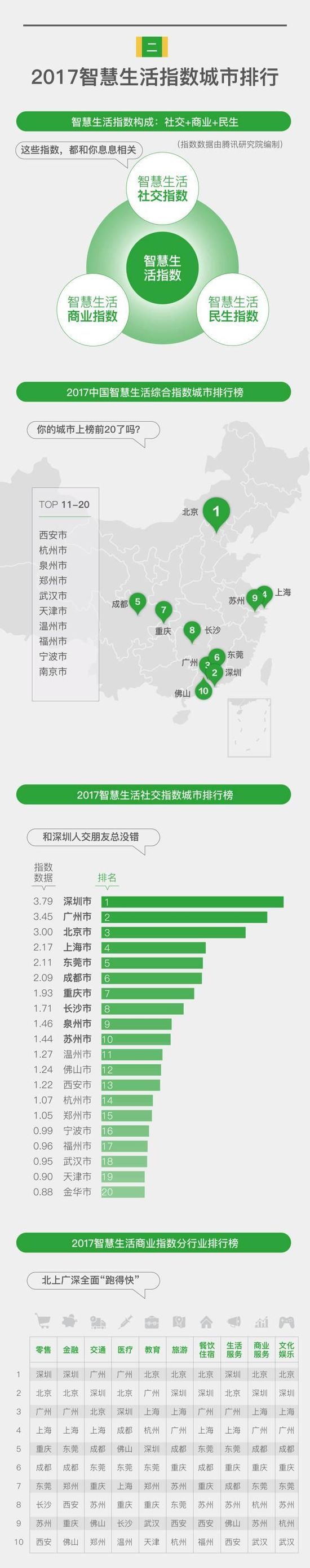 报告首次从社交、商业、民生等多维度展现智慧生活城市指数排行,2017年中国智慧生活综合指数最高的十个城市分别为北京、深圳、广州、上海、成都、东莞、重庆、长沙、苏州、佛山。其中,深圳、广州领跑社交指数城市排行榜, 前二十个城市中,南方城市更多;商业指数上,杭州在教育方面超越深圳名列第四;广州、深圳智慧民生指数较高,佛山、东莞位列第四和第五位,成为榜单中的黑马。