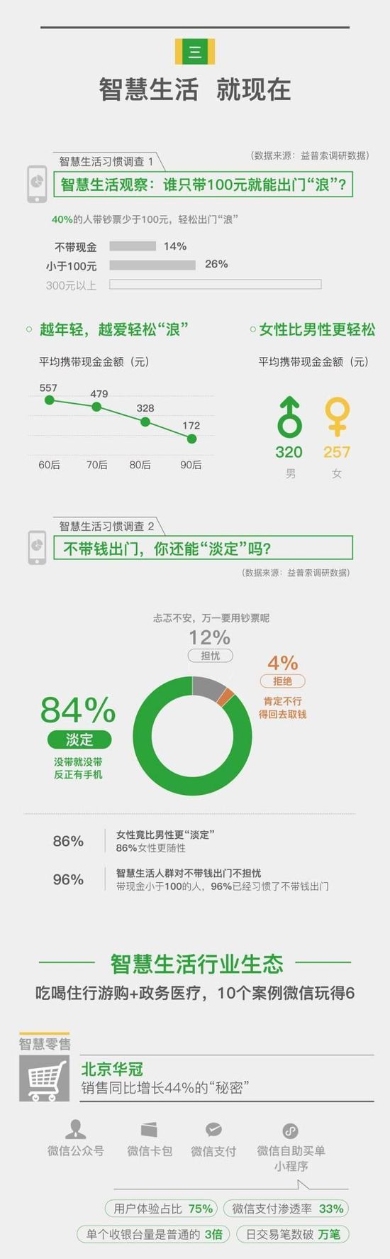 报告显示,在用户日常消费习惯调查中,有40%的人出门带现金少于100元;52%人月均消费里仅20%用现金;超70%的人表示,只能用现金支付时才会使用现金,100元现金可以使用超过一星期;84%的人表示“不带钱、只带手机出门”可以很“淡定”。
