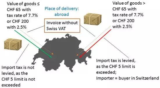 在此之前,当进口货物(进口税)的税额为5 CHF或更少(所谓的小批量货物)时,则不对其征收增值税。此外,货物的交付不受瑞士国内增值税(国内税)的限制。因此,货物的买方可以从国外获得小批量货物而无需支付增值税,而同一批货物如果是从瑞士国内邮购公司或零售商购买的,则须缴纳增值税。