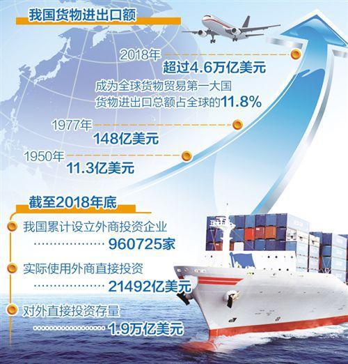 改革开放以来,随着外贸管理体制改革和对外开放水平提升,对外贸易迅速发展。特别是党的十八大以来,我国积极应对错综复杂的国际形势,努力适应外贸发展新常态,加快培育外贸竞争新优势,货物贸易规模实现新突破。2018年我国货物进出口规模超过4.6万亿美元,以人民币计价首次突破30万亿元大关。1978年至2018年,我国货物进出口增长223倍,年均增速14.5%。