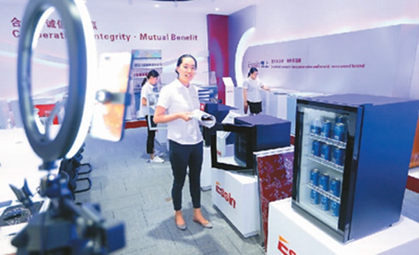6月15日,为期10天的第127届广交会在网上开幕,这是中国首次完全以网络形式举办的广交会。广交会按16大类商品设置50个展区,全部免收参展费用,帮助企业减负纾困,开拓国际市场。图为6月15日,位于山东省青岛市的青岛营上电器有限公司,营销人员通过广交会直播平台推介出口到非洲等海外市场的冰箱产品。