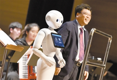 在天津大剧院,智能机器人指挥乐团演奏曲目。新华社记者 李然摄新华社记者 刘惟真 郭方达 张宇琪 走/>