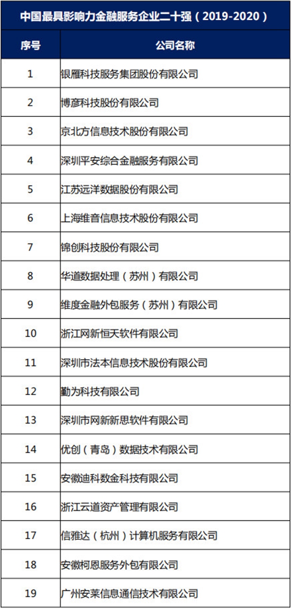 9月29日,由中国外包网携手鼎韬产业研究院发起的“中国最具影响力金融服务企业(2019-2020)”榜单于2020中国(徐州)国际服务外包合作大会服务外包转型升级与开放平台融合发展专题论坛上正式揭晓。