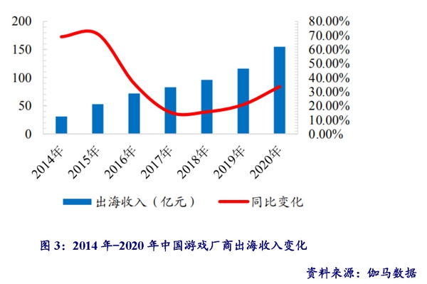 随着国内流量红利的见顶和自研游戏质量的提高,“走出去”战略在2020年得到了继续的贯彻。2020年中国自主研发游戏海外市场规模约1050亿元,同比增长33.25%,连续四年高速增长。