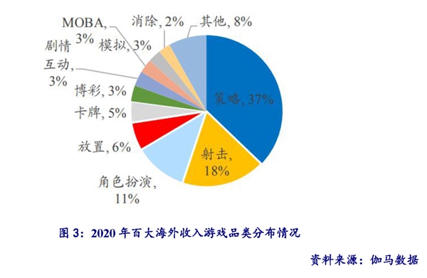 从前百大收入游戏品类来看,2020年RPG游戏的流水占比仍为最大,占比约为19%;MOBA类游戏因其高可玩性,流水增长迅速,占比为达到15.28%,位居第二,FPS游戏位居第三,前三座次保持稳定,占全部市场规模的近一半。海外市场中,策略类游戏的收入占比最高,达37.18%,PFS、RPG游戏分别位居二、三位,占比分别17.97%和11.35%。另外,二次元游戏数量目前已占有优势,但收入比例不及三次元,2020年手游收入排名前100的产品中,写实风格的产品数量占比为35%,卡通动漫风格为65%,但收入占比倒挂,分别为53%和47%。