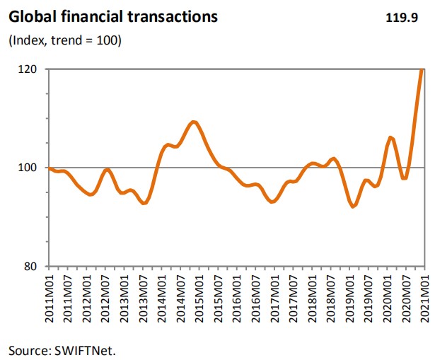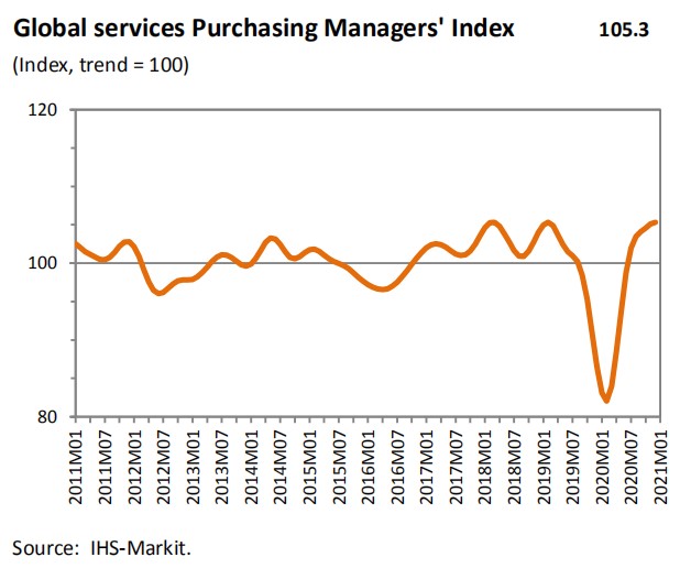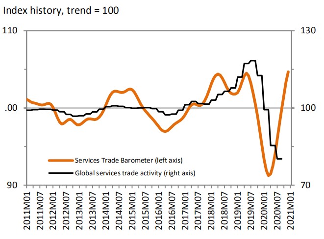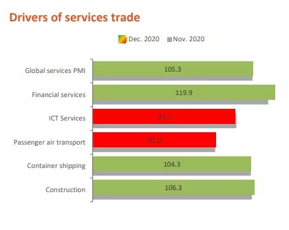 最近的指数读数104.7是有记录以来最高的(可追溯到2000年),远高于基准值100,这表明增长与近期趋势一致。反弹的强度表明,在第二季度触底并在第三季度仅略有回升之后,世界服务贸易的增长在2020年第四季度加速。