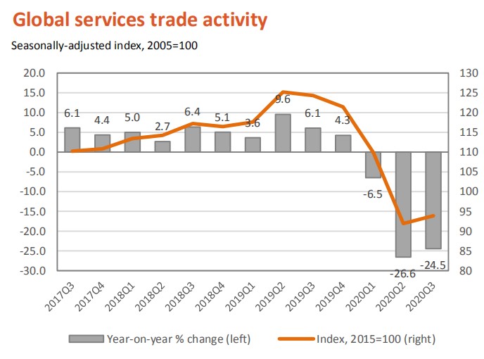 2020年3月世贸组织发布的服务贸易晴雨表显示,全球服务贸易景气指数创下2000年以来的最低点91.2,这是与新冠疫情大流行相关的锁定措施的峰值。