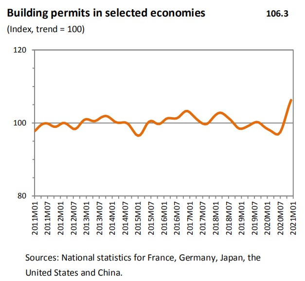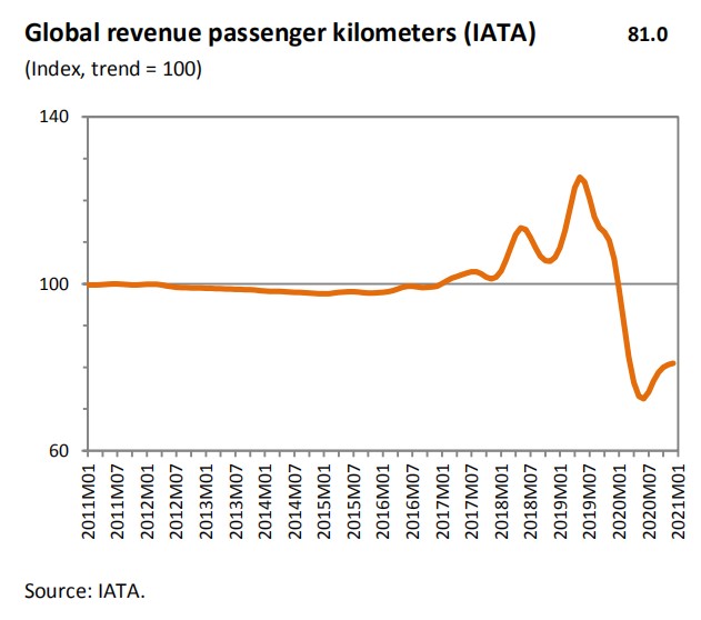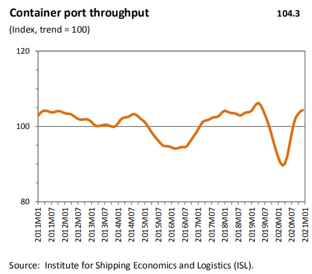 第二波的疫情的影响也反映在晴雨表的成分指数中:航空运输持续疲软(81.0)。WTO预测,如果全球成功为大量人群接种COVID-19疫苗,那么国际客运航班可能会在今年第三季度出现部分复苏。然而,新变种病毒的扩散可能为经济全面复苏带来阻碍。