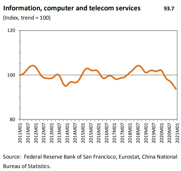尽管新冠肺炎疫情期间信息通讯技术服务需求强劲,但信息通讯技术服务指数却在过去的一年持续下降,最新景气指数只有93.7,是过去十年以来的最低点。数字服务作为全球化4.0的核心驱动力,一直以来也是驱动全球服务贸易发展的核心动力,ICT领域服务贸易景气度持续疲软,反映出目前全球服务贸易复苏的不可持续性。