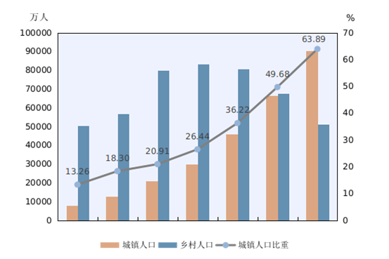 数据:我国居住在城镇的人口为90199万人,占63.89%;居住在乡村的人口为50979万人,占36.11%。与2010年相比,城镇人口增加23642万人,乡村人口减少16436万人,城镇人口比重上升14.21个百分点。