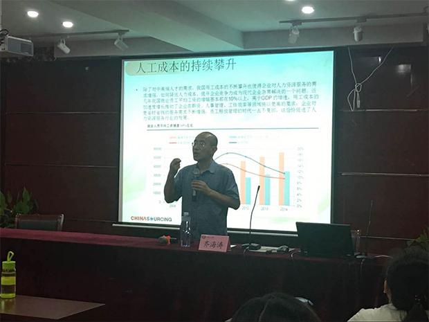 在本次研修课程班上,齐海涛先生分别从人力资源服务的变革、人力资源外包走势、资本驱动下的人力资源外包等三个方面阐释人力资源外包的现状与发展趋势。他提到,随着我国人口老龄化逐渐明显,人口红利的消使得人力资源管理由原来的注重劳动力数量转变为注重劳动力质量,对中高端人才的需求提升。因此,我国人工成本持续攀升,也推动企业在薪资、人事管理、工作效率等领域的要求有所提升,给人力资源服务行业提供了发展空间。而政策的明确导向,如2012年《促进就业规划(2011-2015年)》、2014年《国务院关于加快发展生产性服务促进产业结构调整时机的指导意见》、2014年《关于加快发展人力资源服务业的意见》,都明确指出加大开发人力资源、加强人力资源市场建设以及对于2020年人力资源服务从业人员的预期,进一步推动合肥乃至全国人力资源服务行业的变革。
