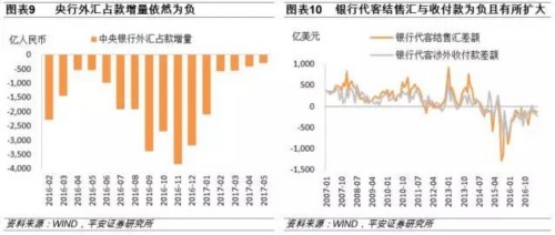 除国际收支表之外,我们还可以用一些月度高频指标来看待资本外流的最新变化。如图9所示,截至2017年5月,尽管规模不断收缩,但央行外汇占款在增量依然持续为负。如图10所示,截至2017年5月,银行代客结售汇与银行代客涉外收付款差额依然持续为负,且与前月相比有所扩大。