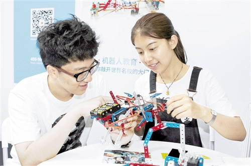 6月13日,一名观众(左)在2016中国智慧教育创新展的一个展位上咨询机器人教育课程方案。当日,由中关村科技园区海淀园管委会主办,中关村互联网教育创新中心、互联网教育商会承办的为期17天的“科技教育 创享未来‘互联网+教育’创新周”系列活动在北京闭幕。新华社记者 刘莲芬摄