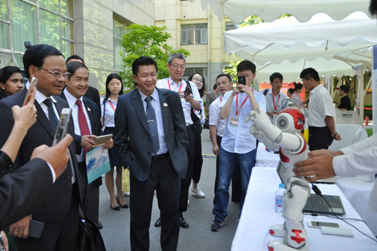 在现场,一个能用流利的英语和观众交流的机器人吸引了众多人的目光。当操作者用英文问他你来自哪里的时候,他自信地回答:湖北省。随即向外宾们介绍起湖北省的地理位置和地方特色。最后还跳起了“小苹果”,优美的歌声和舞姿让观众如痴如醉。