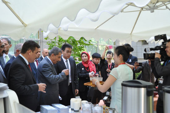 巴勒斯坦法塔赫中央委员、群众组织部部长陶菲克·提拉维在一家展台前品尝湖北特色茶饮,连连赞叹味道香浓。现场有记者问,和他家乡产的茶有什么不同时,他想了一会儿,回味着说:“这个味道非常独特,让人难忘。”