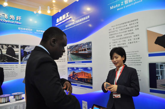 坦桑尼亚驻华大使姆贝尔瓦·凯鲁基驻足于一家高科技产品展台前,仔细聆听工作人员对产品的介绍,听完后他认真地说:“这个产品我想买回去。”