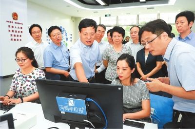 6月21日,省委书记、省人大常委会主任谢伏瞻等在河南日报报业集团“中央厨房”调研媒体融合发展情况。记/>