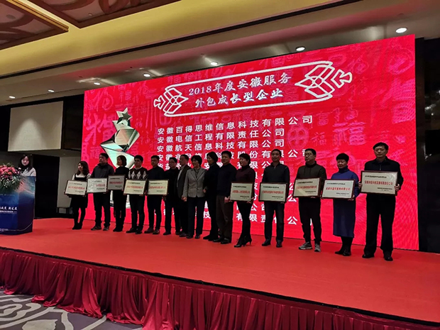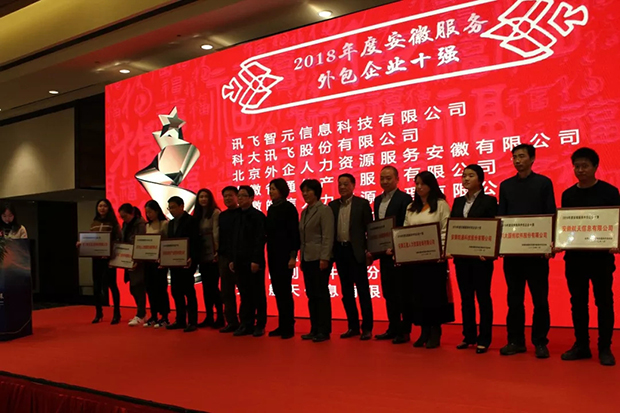 最后大会发布了2018年度安徽服务外包企业十强及成长型企业名单。上海外服安徽人力资源服务有限公司、讯飞智元信息科技有限公司、科大讯飞股份有限公司、北京外企人力资源服务安徽有限公司等20家企业获奖,并进行了现场颁奖。