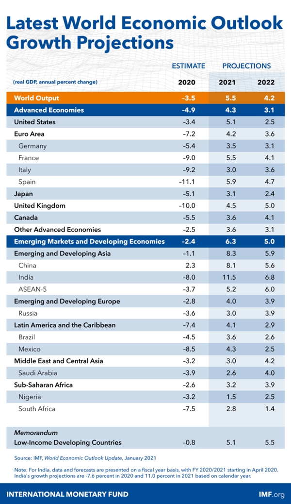 国际货币基金组织(IMF)最新发布《世界经济展望报告》更新内容,由于2020年下半年全球经济增长势头好于预期,2020年全球经济或收缩3.5%,较此前预测收窄0.9个百分点。同时,基于今年晚些时候新冠疫苗将加速推广以及部分经济体增加政策支持等预期,IMF上调2021年全球经济增长预期,预计2021年全球经济增长5.5%,并预计2022年全球经济增长4.2%。