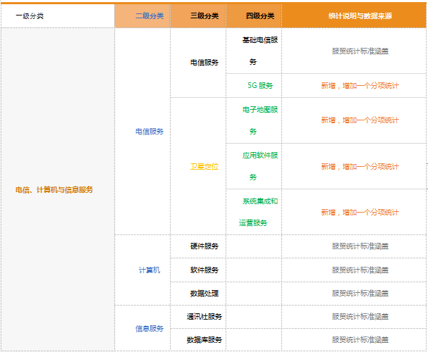 1、“电信、计算机和信息服务”:原服务贸易分类和统计中的“电信、计算机和信息服务”,在“电信”服务中增加“5G服务”和“卫星定位”服务,以及在“信息服务”中增加“数字媒体”和“数字阅读”服务。