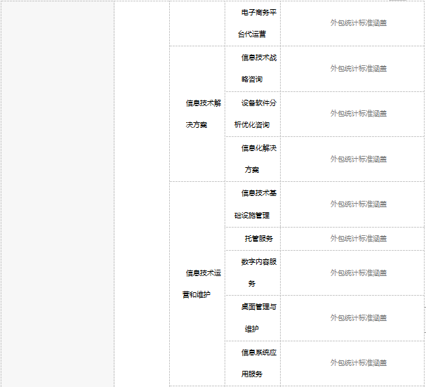 根据《服务外包统计调查制度》和《服务外包产业重点发展领域指导目录》,其中“离岸信息技术外包”主要包括八个细分门类: