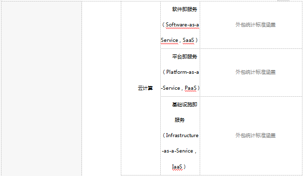 2、“离岸外包服务”:原服务外包分类和统计中,首先确定离岸外包服务中的数字化部分(“离岸信息技术外包”+离岸业务流程外包中的“互联网媒体”和“智能客服”+离岸知识流程外包中的“大数据服务”),同时增加数字技术服务的“物联网(工业互联网)服务”。
