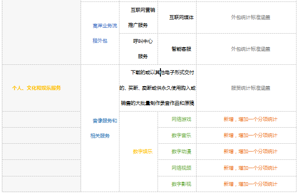 对比传统服务贸易标准统计中的“个人、文化和娱乐服务”门类。