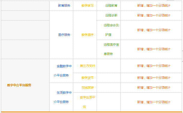 4、“数字中介平台服务”:在服务贸易分类和统计中,新增项,涵盖“金融数字中介平台服务”,包括第三方支付、数字货币;“生活数字中介平台服务”,包括在线旅游、数字生活平台。