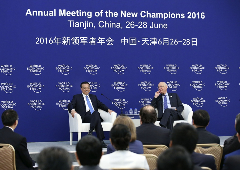 李克强在天津会见2016夏季达沃斯论坛企业家代表。新华社记者 庞兴雷 摄在夏季达沃斯论坛开幕致辞中提/>