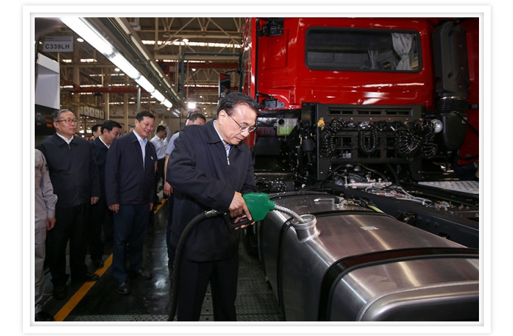 2016年5月23日,李克强总理到湖北十堰考察东风商用车重卡新工厂,在装配生产线旁应邀为新型重卡加油。总理说,“这不仅是为东风加油,也是为中国制造加油!”随后他登上一辆重型卡车并强调,东风发展要力戒“大而全”。只有做强主业、做优品质,才能在世界市场一争高下。