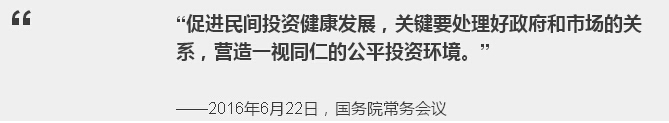 2016年6月22日,李克强总理召开国务院常务会议,听取民间投资政策落实专项督查工作汇报。李克强总理说:“民间投资、民营经济的发展,不仅直接利于当前稳增长、保就业,对于长远的结构性改革尤其是供给侧结构性改革都具有重要意义。”总理强调,促进民间投资健康发展,关键要处理好政府和市场的关系,营造一视同仁的公平投资环境。针对5月下旬开展专项督查以来发现的问题,总理说:“我们必须要以壮士断腕的勇气和决心推进改革,切实整改督查发现的突出问题!”