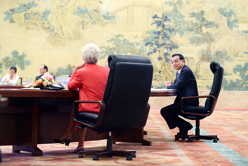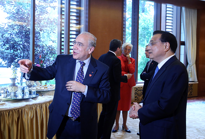 7月22日上午,李克强总理在钓鱼台芳华苑同世界银行行长金墉、国际货币基金组织总裁拉加德、世界贸易组织总干事阿泽维多、国际劳工组织总干事莱德、经济合作与发展组织秘书长古里亚、金融稳定理事会主席卡尼举行"1+6"圆桌对话会。