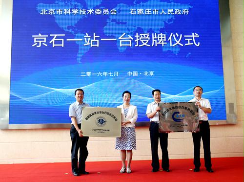 闫傲霜主任与郝竹山副市长共同为"首都科技条件平台石家庄合作站"、"北京技术市场石家庄服务平台"授牌