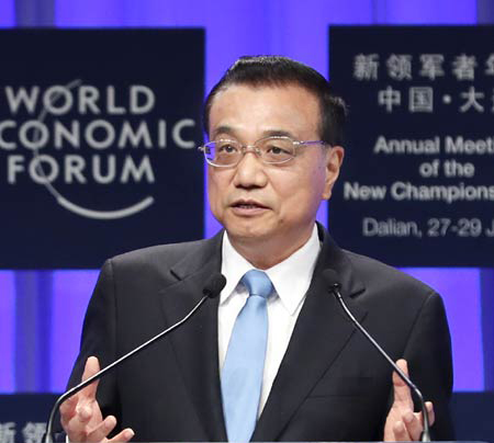 2017年夏季达沃斯论坛在大连召开,27日中国国务院总理李克强发表开幕式致辞,表示中国经济保持中高速/>