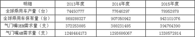 气门嘴市场需求主要分为 OEM 市场和 AM 市场,汽车产量决定 OEM 市场需求量,汽车保有量决定 AM 市场需求量。气门嘴是汽车车轮模块的重要安全件,因其长期暴露在外需承受各种恶劣环境、在汽车高速运转时需要承受较强的剪切力,气门嘴容易损耗,汽车年检、更换轮胎时一般会更换气门嘴,故气门嘴 AM市场需求量远高于 OEM 市场。根据 2013 至 2015 年度全球乘用车产量、保有量测算 2013 至 2015 年度全球气门嘴需求量:
