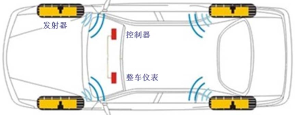TPMS 通过在每个车轮上安装包含有高灵敏度的传感器芯片的发射器,在行车或静止的状态下,实时监测轮胎的压力、温度等数据,并通过无线射频方式发射到控制器,在整车仪表上显示各种数据变化并在轮胎漏气和压力变化超过安全门限时进行报警,以保障行车安全。TPMS 产品集中了汽车电子技术、传感器技术、无线通信技术,由发射器(通过气门嘴固定在轮胎内)、控制器(含天线)、显示界面器(通常集成在整车仪表中)三部分构成,其在整车位置如下图所示: