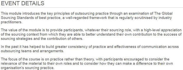 据官网介绍,The Outsourcing Life Cycle And Best Practice Standard(2)—外包生命周期与最佳实践标准(第二期)活动,将于伦敦当地时间,2017年9月5日周二上午9点-下午5点在伦敦举行。