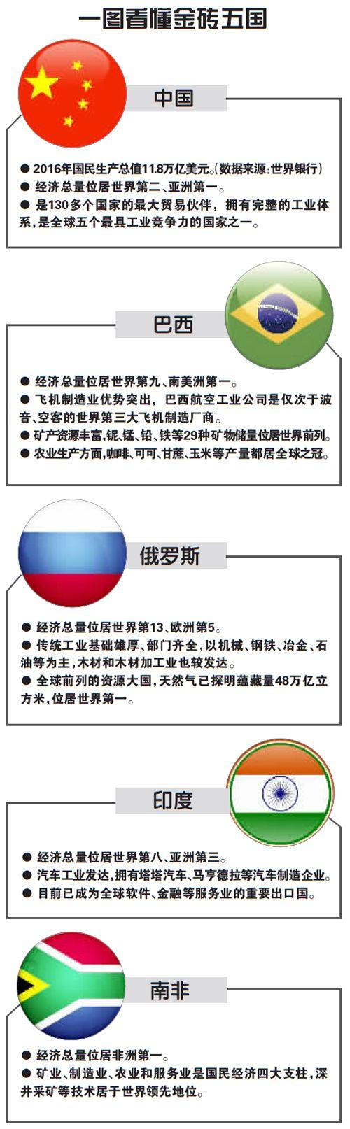 值得一提的是,在携手并进的同时,金砖五国相互间也存在较强的互补性。中国国家开发银行研究院等联合撰写的《金砖国家可持续发展报告(2017)》披露,金砖国家合作紧密但仍有发展空间,中国是“世界工厂”,拥有完整的工业体系,制成品出口优势明显;巴西是“世界原料基地”,农牧业发达,矿产资源丰富;俄罗斯是“世界加油站”,油气资源丰富;印度是“世界办公室”,IT优势明显;南非乃“非洲门户”,金融业非常发达。