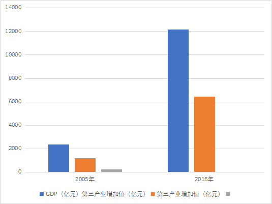 目前,成都已正成为海内外服务外包产业的资源汇聚地,成为众多跨国公司和国内知名企业实施战略布局的重要城市之一。从成都市发展服务外包产业前后的经济数据来看,成都市生产总值由2005年的2371亿元增长到2016年的12170.2亿元,翻了几番;三类产业结构由2005年的7.7:42.5:49.8调整到2016年3.9:43.0:53.1,第三产业比重明显提高,而且成都市服务贸易也得到快速发展,2016年服务贸易进出口额超过120亿美元,而2005年四川全省服务贸易进出口总额只有7.7亿美元。另外,成都市的从业人口规模也有明显提升,2016年总从业人员达到876.7万人,比2005年增加两百多万人。