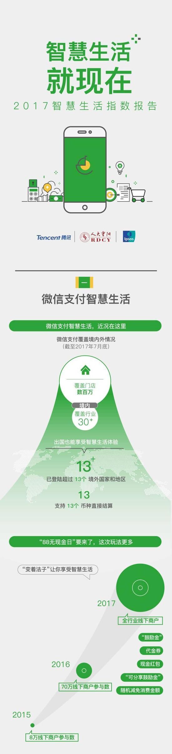 31日在广州举行的“微信智慧工坊PRO版”发布的《2017智慧生活指数报告》(以下简称“报告”),梳理了微信支付生态四年发展逻辑,凸显了四大发展趋势和商机。