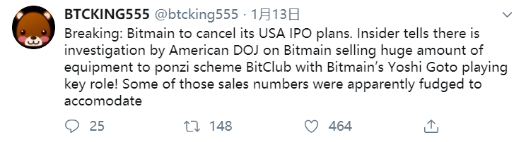 1月14日,有推特用户曝料:比特大陆可能取消赴美IPO,原因是被美国司法部调查。调查据称与比特大陆向BitClub出售大量挖矿设备有关,后者正因参与加密货币庞氏骗局,受到美国当局指控。