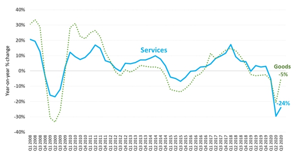 世贸组织1月26日发布的全球服务贸易统计数据显示,2020年第二季度,全球服务贸易额同比下滑30%,创2008年至2009年国际金融危机以来最大跌幅;2020年第三季度全球服务贸易同比下降仍然达到24%,2020年11月,全球服务贸易仍比2019年同期水平低16%。
