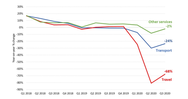 旅游行业仍然是受影响最严重的服务部门。具体而言,2020年第三季度,拉丁美洲和加勒比海地区的国际旅行支出同比下降88%,亚洲和非洲均下降80%,北美下降78%,欧洲下降55%。国际民航组织(ICAO)在最新的疫情经济影响分析报告中确认,国际客运量在2020年急剧下降60%,使航空客运总量回落到2003年的水平。