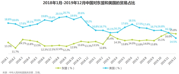 在两年间,中国对美贸易总额占比整体处于下降趋势,而对东盟贸易却呈现上升趋势。这一方面说明,基础工业制造向生产成本更低的国家转移,中国不知不觉间也成为了基础商品的需求方;另一方面也为中国维持固有庞大的国家轻重工业找到了新的平衡点。